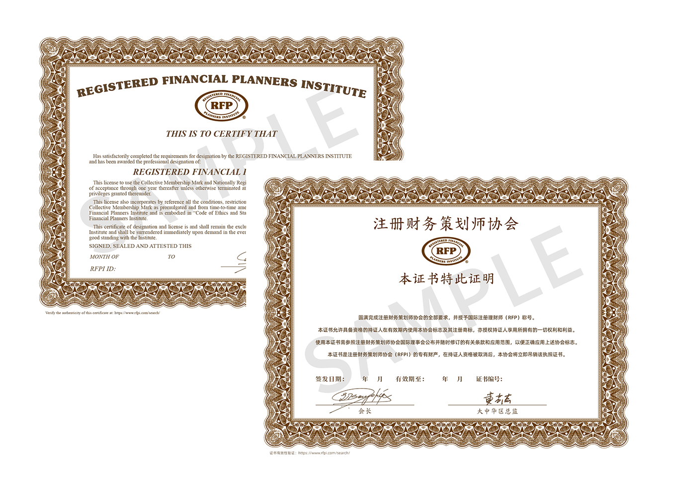 考试合格后,由美国注册财务策划师协会直接颁发RFP中英文证书。